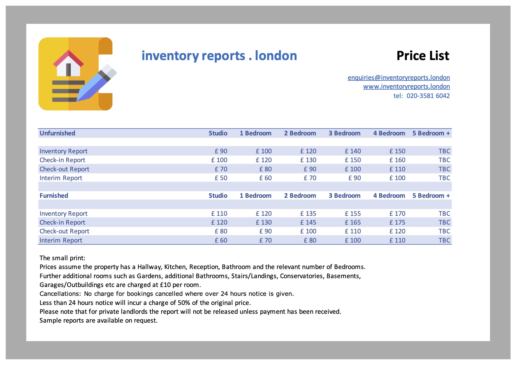 Prices assume the property has an Entrance/Hallway, Kitchen, Reception, Bathroom and the relevant number of Bedrooms. Additional rooms (e.g. gardens, additional bathrooms, stairs/landings, conservatories, basements, garages/outbuildings) are charged at: £10 per additional room.